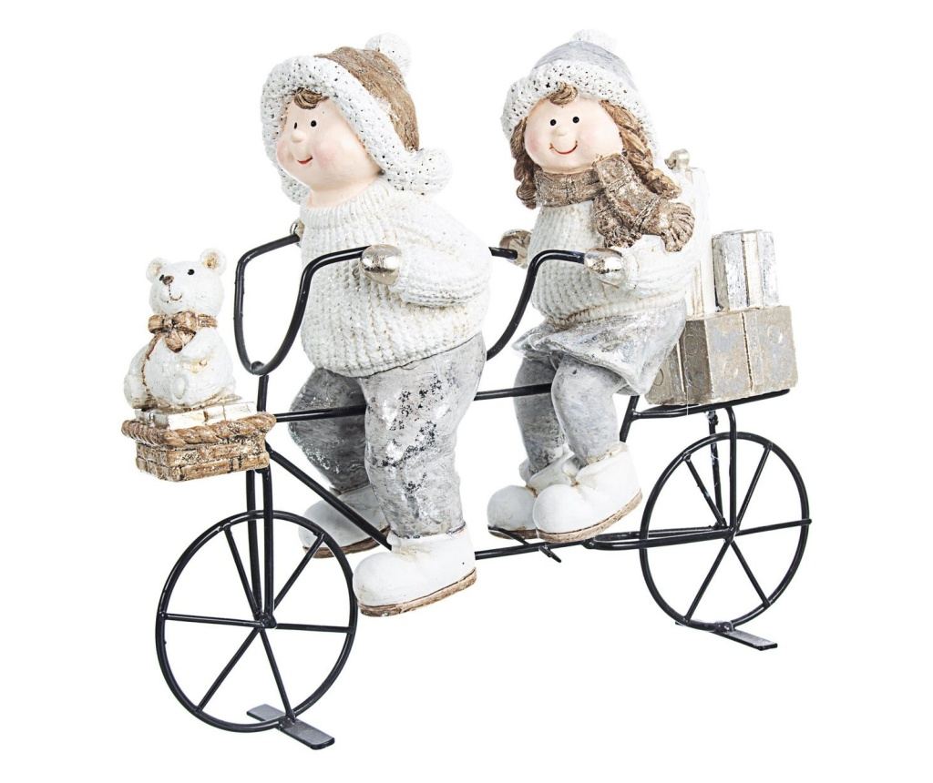 Materiál figúrky: Keramika. Materiál bicykla: Kov. Rozmery: Dĺžka 29 cm x Šírka 10 cm x Výška 25 cm. Farba figúrky: Biela, Krémová. Farba bicykla: Čierna. Ozdobte si svoj domov na Vianoce a pozvite blízkych na návštevu a spoločné chvíle. Táto dekoratívna figúrka dievčaťa a chlapca je ideálna na umiestnenie pod vianočný stromček alebo na nábytok, vyžaruje šarm a vianočnú mágiu. Vyrobená z vysoko kvalitných materiálov, táto figúrka si zachová svoj lesk po celé roky. Táto dekorácia je perfektný vianočný darček, ktorý prinesie sviatočnú atmosféru do každého domova.
